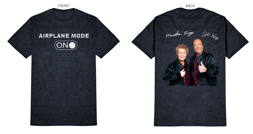 You can own and wear the King Schools John & Martha Airplane Mode T-Shirt for one penny plus shipping. There are a limited number of shirts and sizes available and when they are sold out, they are gone.