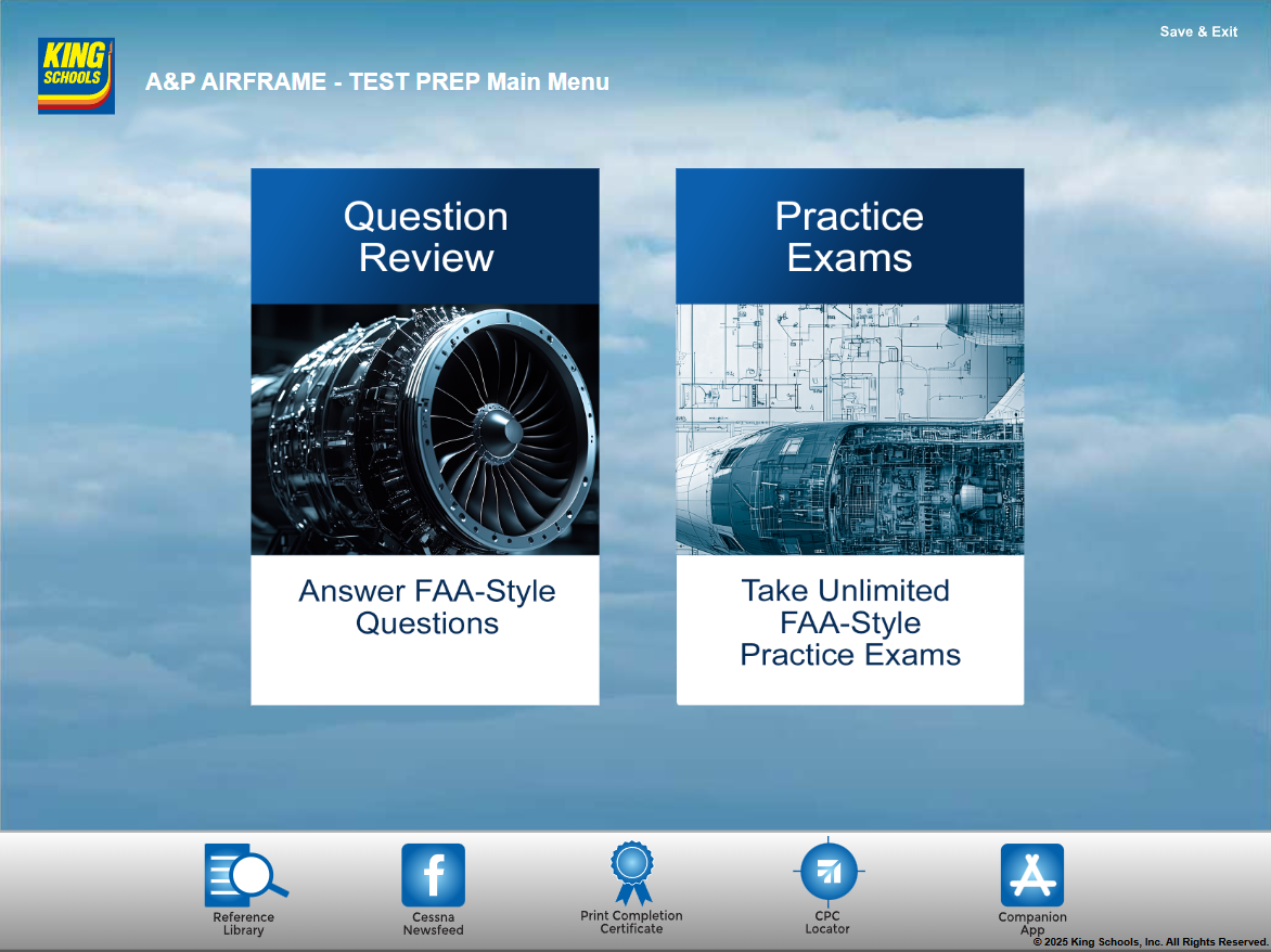 Get exam-ready with King Schools Aircraft Mechanic A&P Test Prep Apps, designed specifically for Aircraft Maintenance Technicians (AMTs) preparing for their FAA written exams. Choose from three individual apps—General, Airframe, or Powerplant—or get the complete 3-Test Bundle for full coverage.