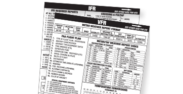 IFR side gives you required reports, crossing a fix / FAF memory aids, pre-approach items, pop-up clearance items, temperature conversion chart, VOR check requirements, two-way radio communications failure regs, and holding pattern entry procedures.